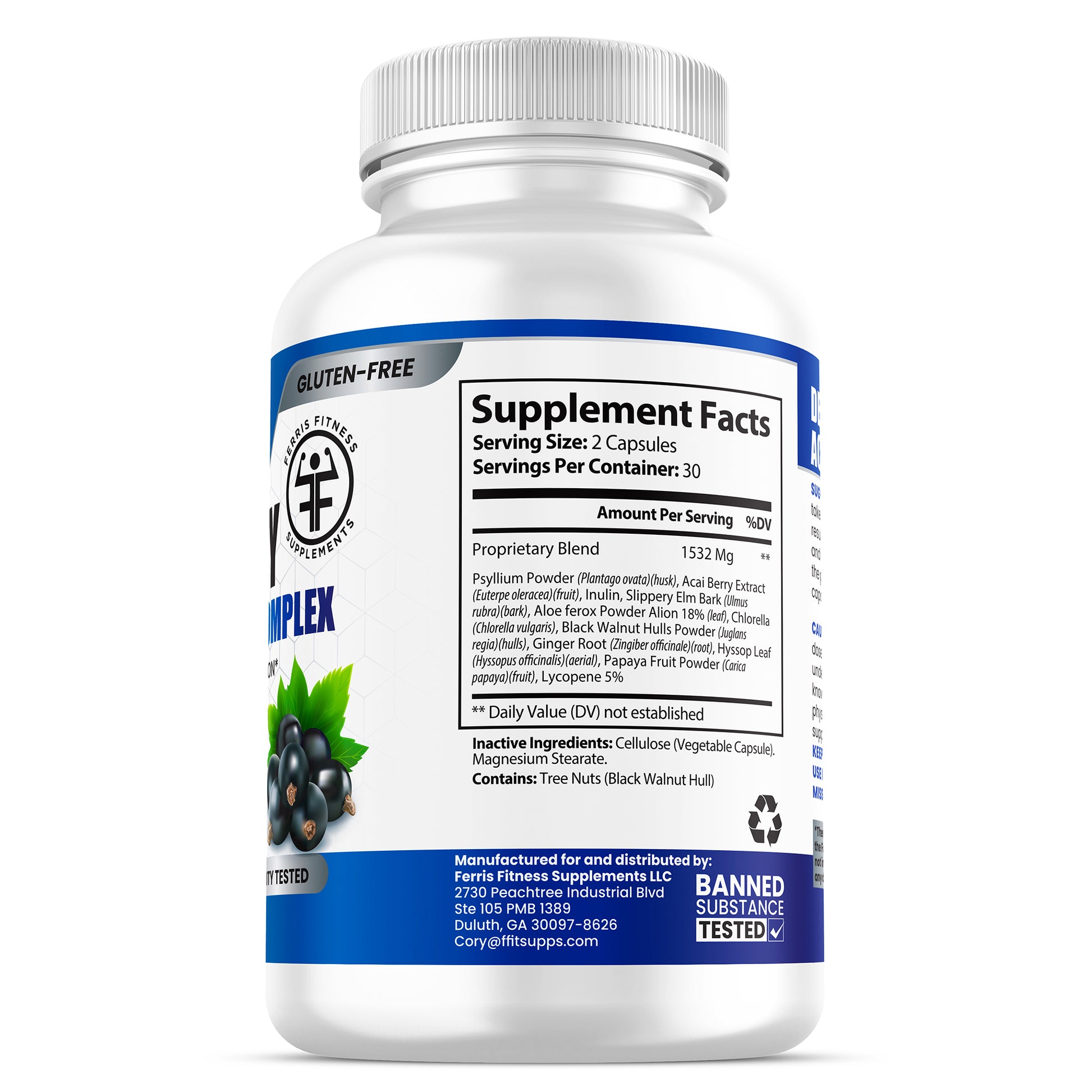 Ingredients: Proprietary Blend (Psyllium Powder, Acai Berry Extract, Inulin, Slippery Elm Bark, Aloe Ferox Powder Alion 18%, Chlorella, Black Walnut Hulls Powder, Ginger Root, Hyssop Leaf, Papaya Fruit Powder, Lycopene 5%, Cellulose (Vegetable Capsule), Magnesium Stearate.