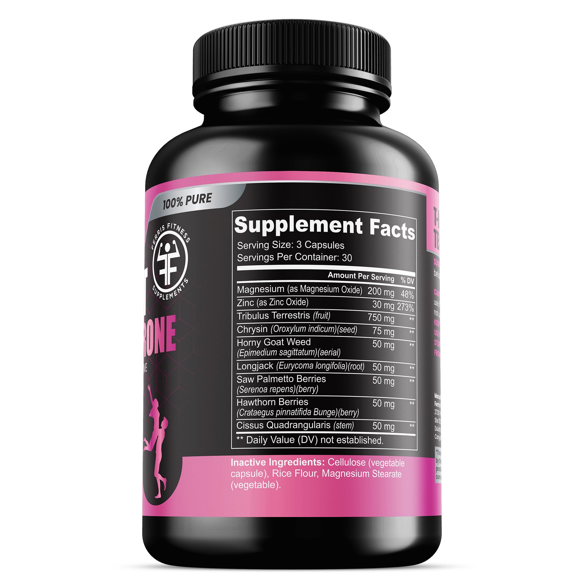 Ingredients: Magnesium (as Magnesium Oxide), Zinc (as Zinc Oxide), Tribulus Terrestris (fruit), Chrysin (seed), Horny Goat Weed (aerial), Longjack (root), Saw palmetto Berries, Hawthorn Berries, Cissus Quadrangularis (stem), Cellulose (vegetable capsule), Rice Flour, Magnesium Stearate.
