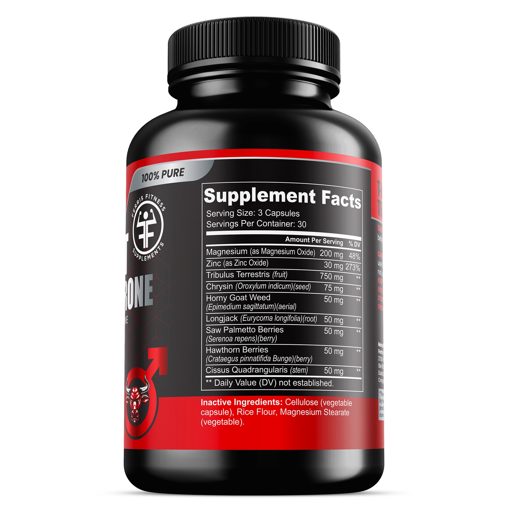 Ingredients: Magnesium (as Magnesium Oxide), Zinc (as Zinc Oxide), Tribulus Terrestris (fruit), Chrysin (seed), Horny Goat Weed (aerial), Longjack (root), Saw palmetto Berries, Hawthorn Berries, Cissus Quadrangularis (stem), Cellulose (vegetable capsule), Rice Flour, Magnesium Stearate.